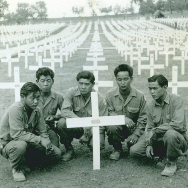 Nisei soldiers pay their respects to a fallen comrade. Behind every medal and battlefield honor was a cost measured in friendship, sacrifice, and lives that never made it home.